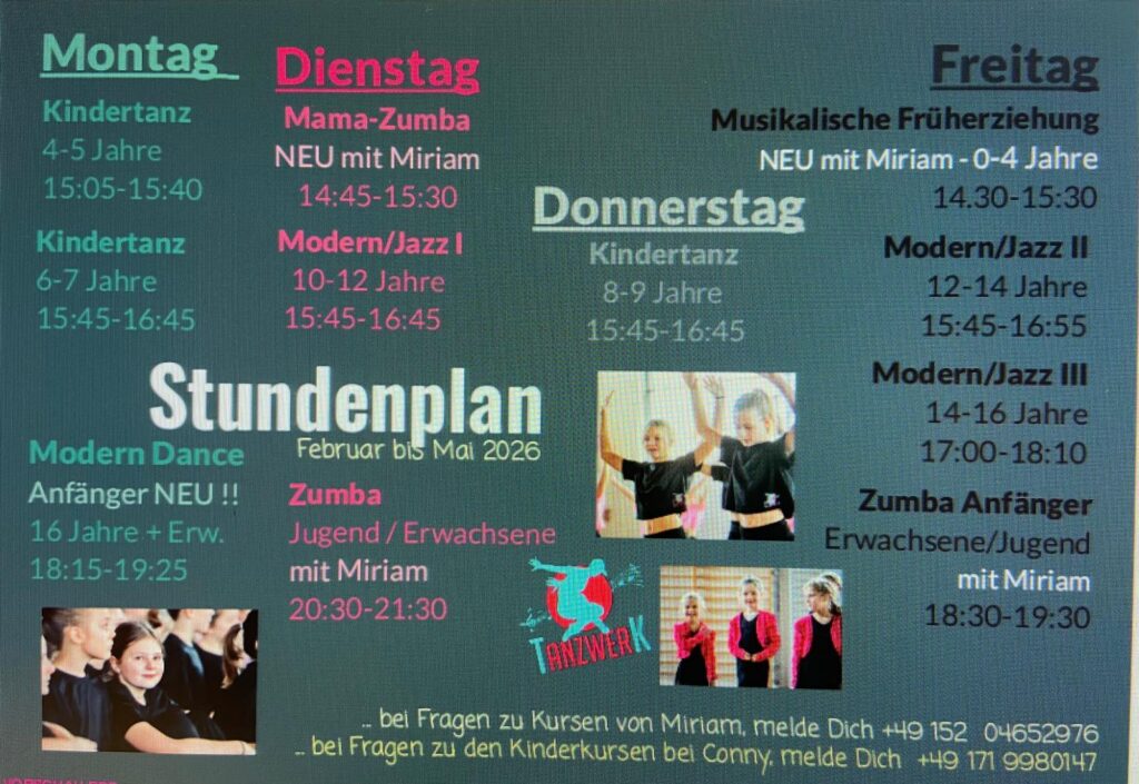 Cornelia Auanger bietet die ganze Woche Tanzstunden für Kinder aller Altersklassen in unseren Räumen an. Ebenso verschiedene Tanz und Zumba Angebote für Jugendliche und Erwachsene.